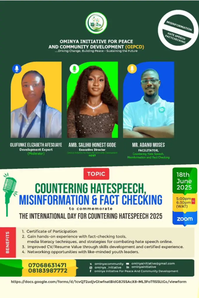 On June 18th, Ominya Initiative hosted a powerful virtual workshop on Hate Speech, Misinformation, and Fact-Checking to commemorate the International Day for Countering Hate Speech, engaging participants in critical conversations around online information ethics and responsible digital citizenship.
